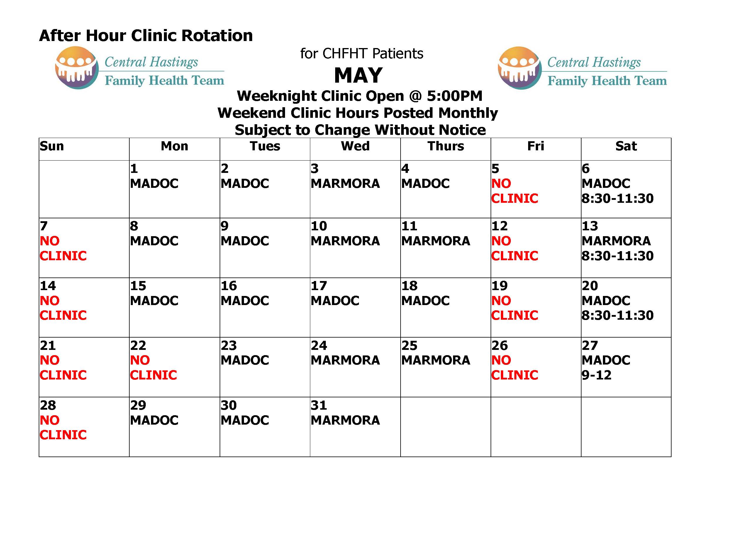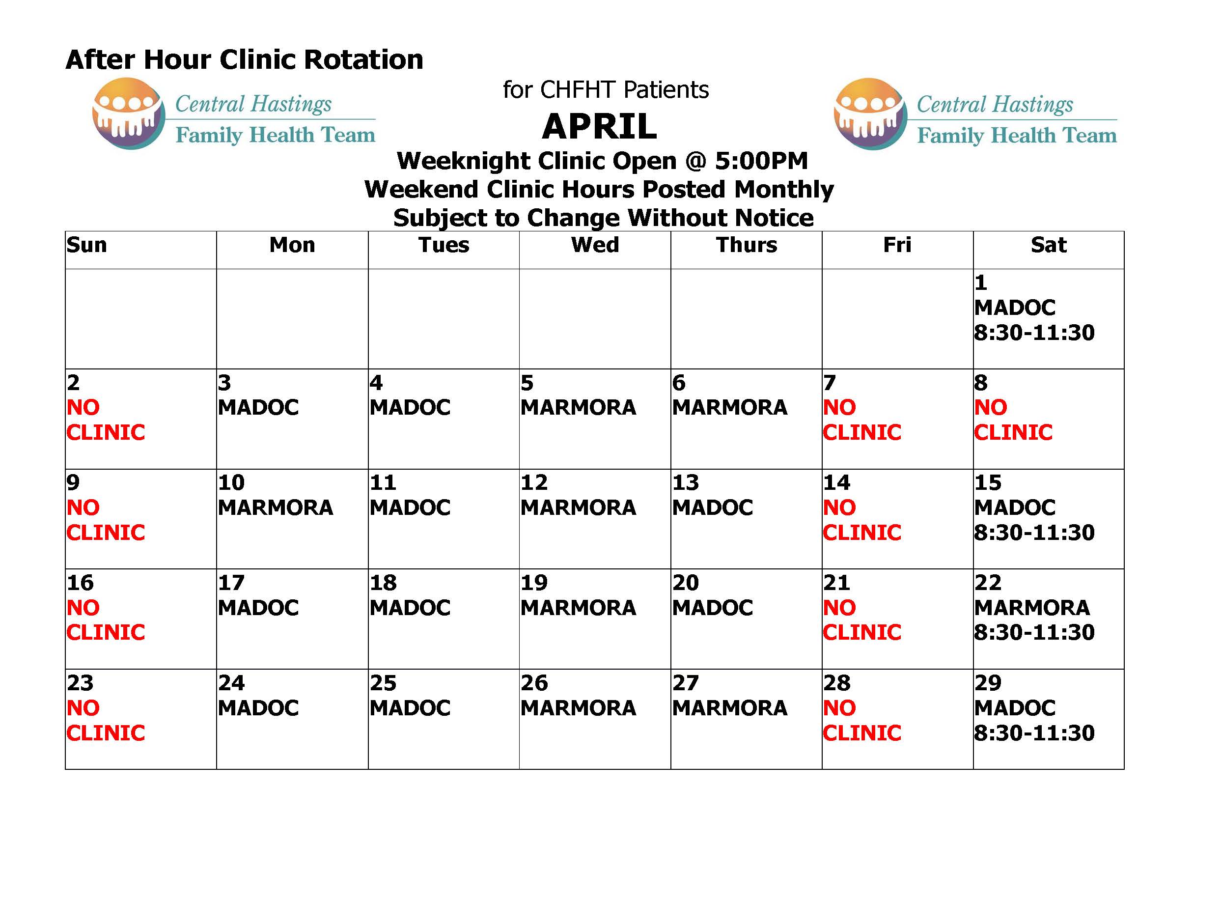 The After Hours Clinics are for rostered patients of CHFHT.