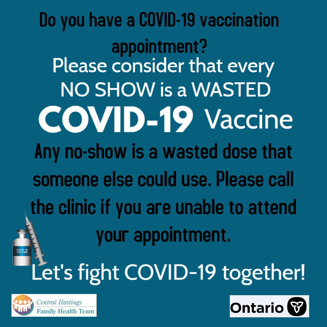 Please consider that every NO SHOW is a wasted COVID-19 Vaccine. Any NO SHOW is a wasted dose that someone else could use. Please call the clinic if you are unable to attend your appointment.