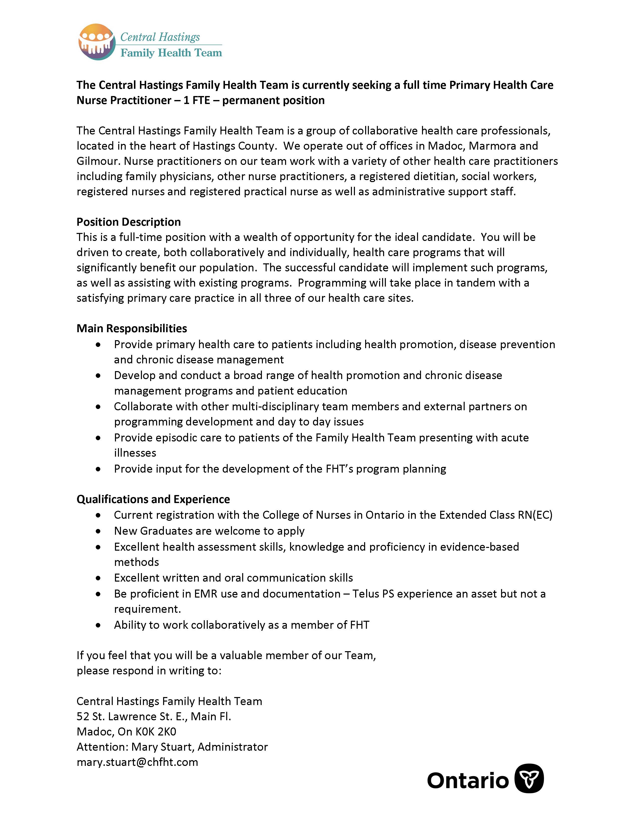 The Central Hastings Family Health Team is currently seeking a full time Primary Health Care Nurse Practitioner – 1 FTE – permanent position