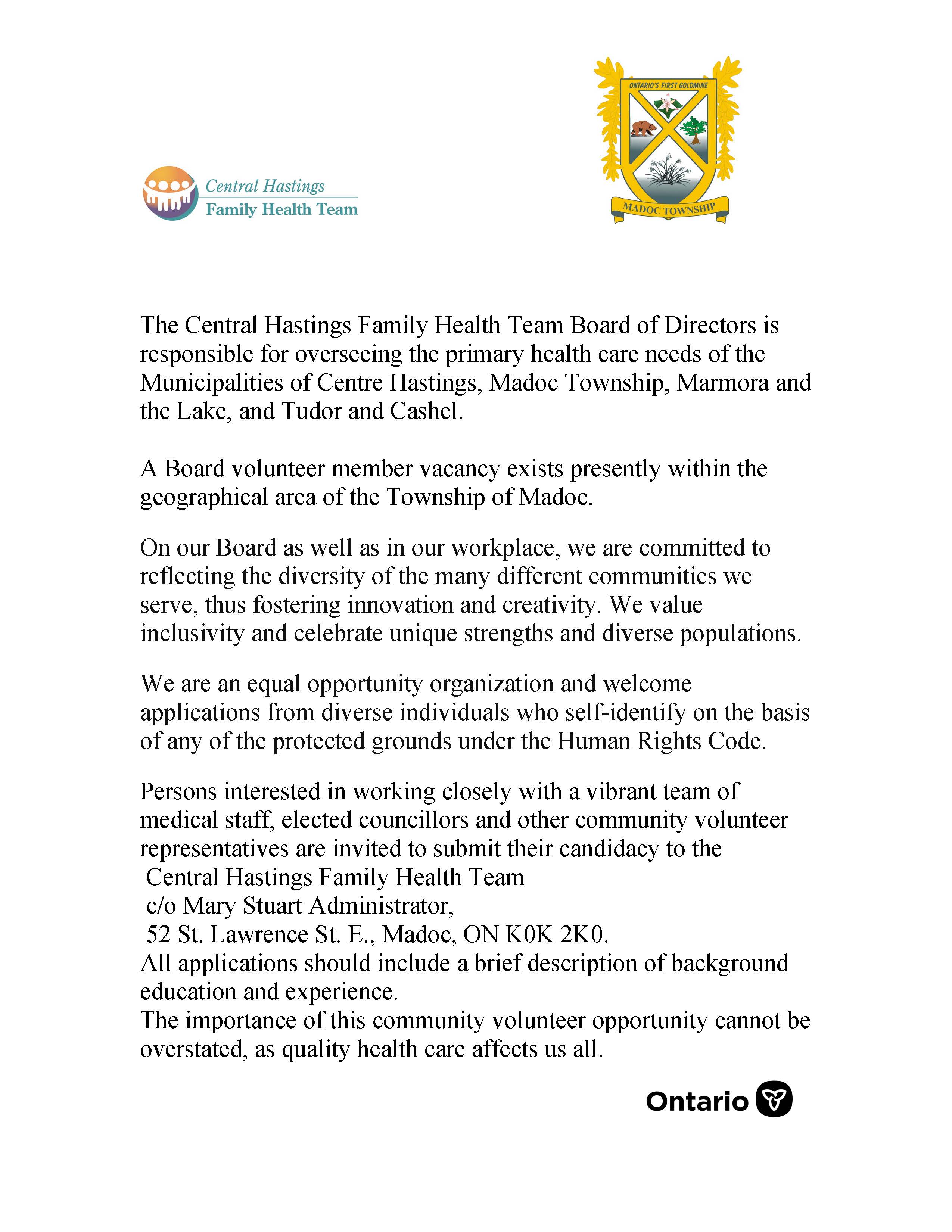 A Board volunteer member vacancy exists presently within the geographical area of the Township of Madoc.