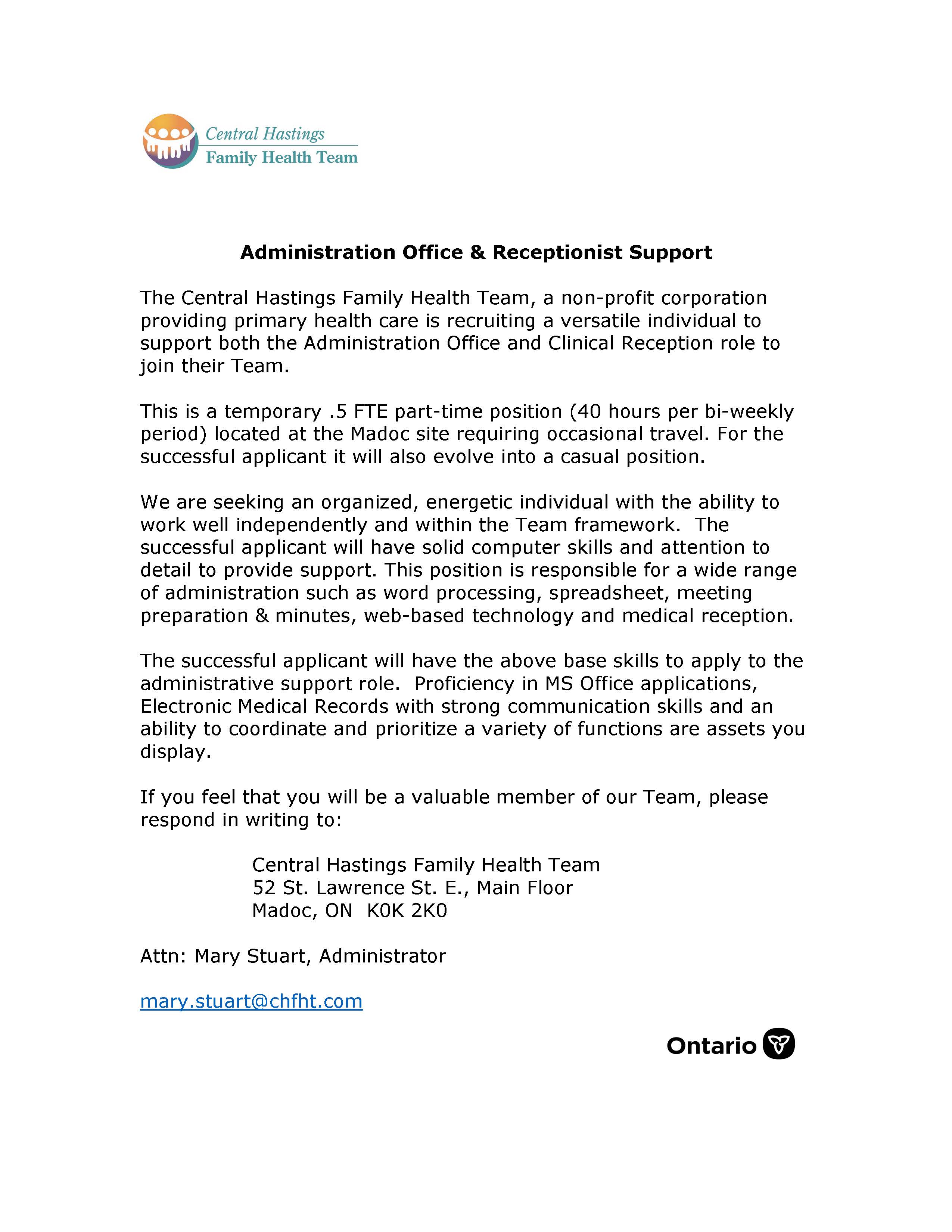 The Central Hastings Family Health Team, a non-profit corporation providing primary health care is recruiting a versatile individual to support both the Administration Office and Clinical Reception role to join their Team.